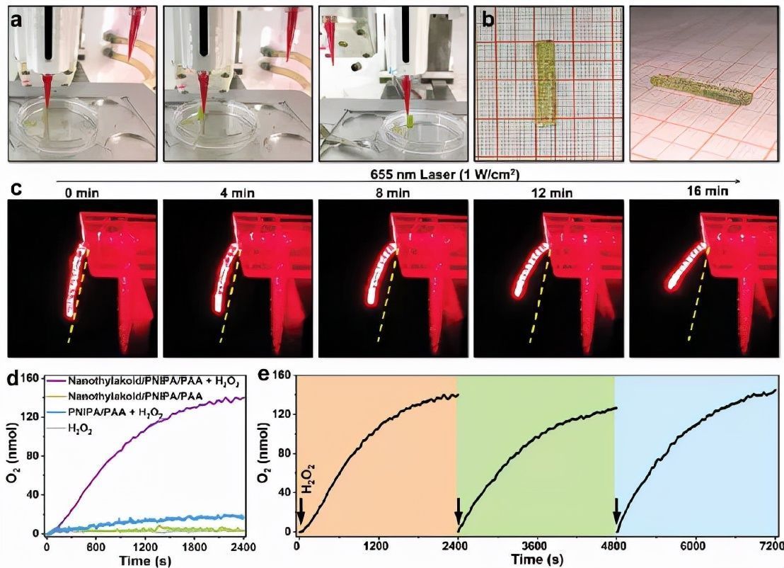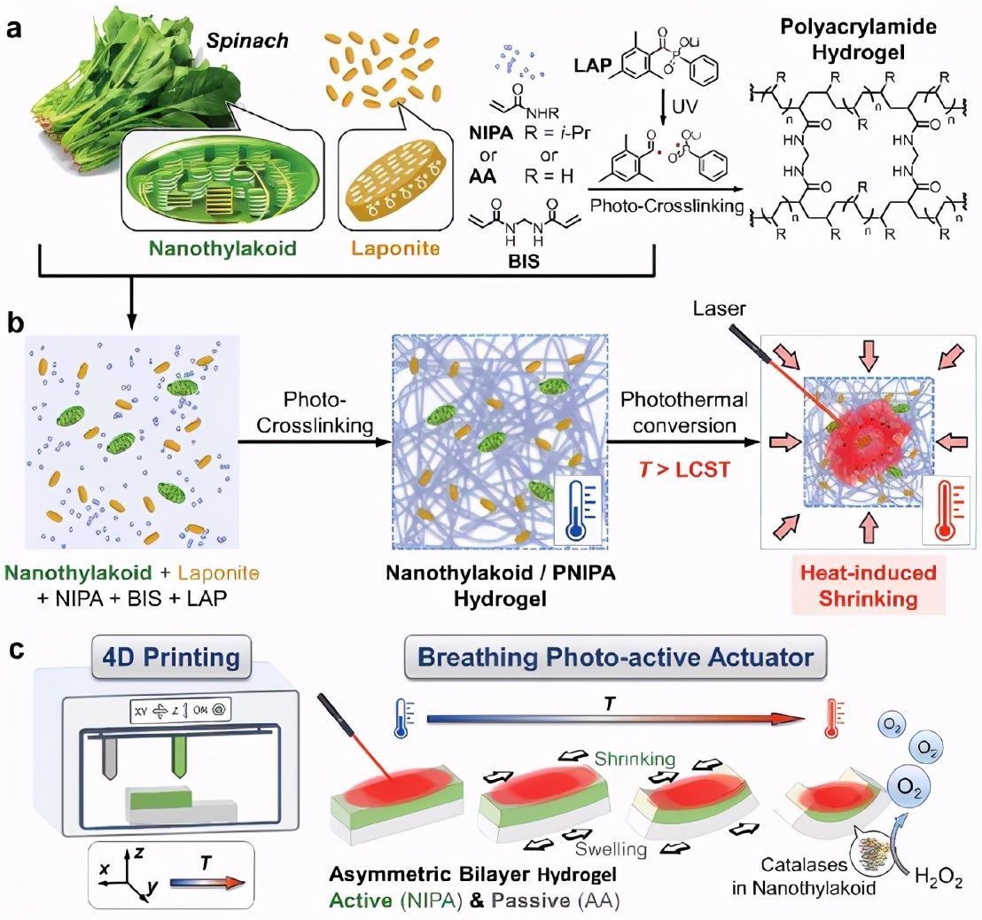 形状变形执行器可以伴随形态变化呼吸以模拟植物事件,用软水凝胶材料制造具有挑战性。最近,中科院科研人员报道了 4D 打印的智能水凝胶执行器不仅可以动态变形,还可以在外部刺激下产生氧气 (O2)。 打印的呼吸执行器具有菠菜叶衍生的类囊体膜(纳米类囊体),用于光热转换和催化 O2 演化,聚(N-异丙基丙烯酰胺)(PNIPA)热响应聚合物网络,用于通过膨胀/收缩(再水化/脱水)产生变形力,和不对称双层聚(N-异丙基丙烯酰胺)/聚丙烯酰胺(PNIPA/PAA)结构来放大机械运动。