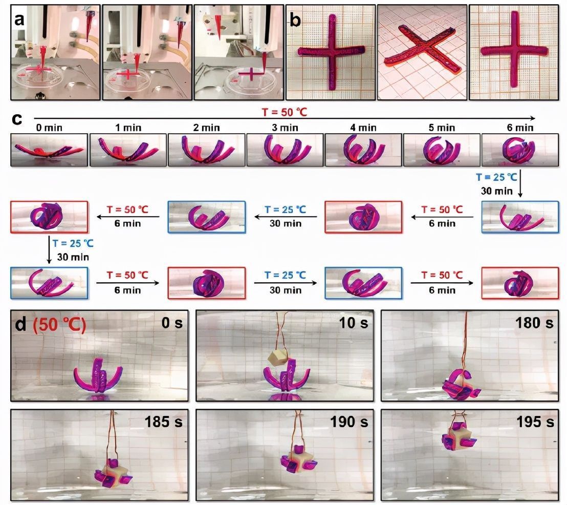 图5 四臂花形PNIPA/PAA双层结构致动器的热响应开/关及其作为机械手的潜力。