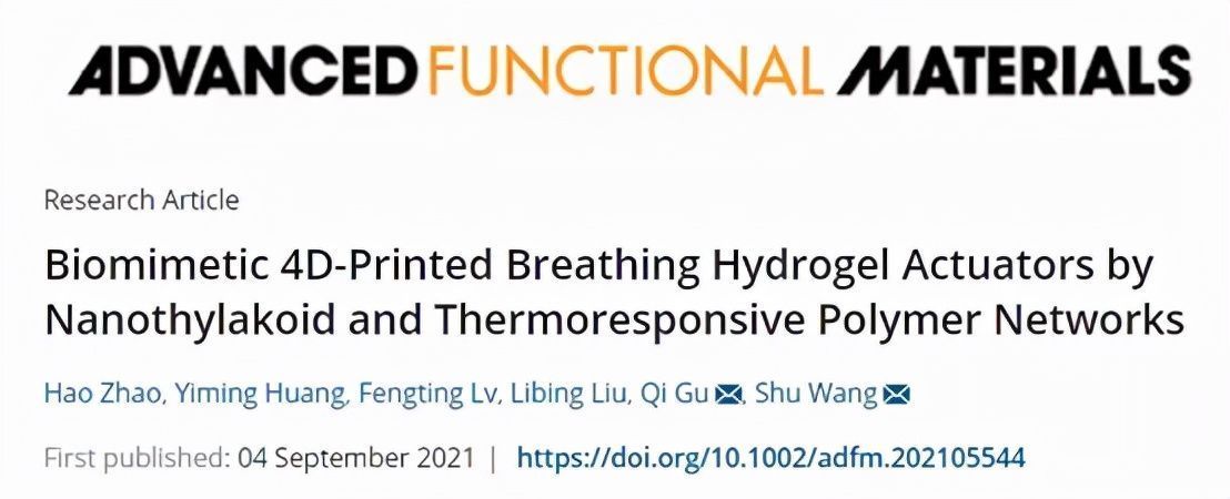 相关论文以题为 Biomimetic 4D-Printed Breathing Hydrogel Actuators by Nanothylakoid and Thermoresponsive Polymer Networks 发表在《 Advanced Functional Materials 》上。 通讯作者 是 中国科学院动物研究所 顾奇研究员 ,和 中国科学院化学研究所 王树研究员 。