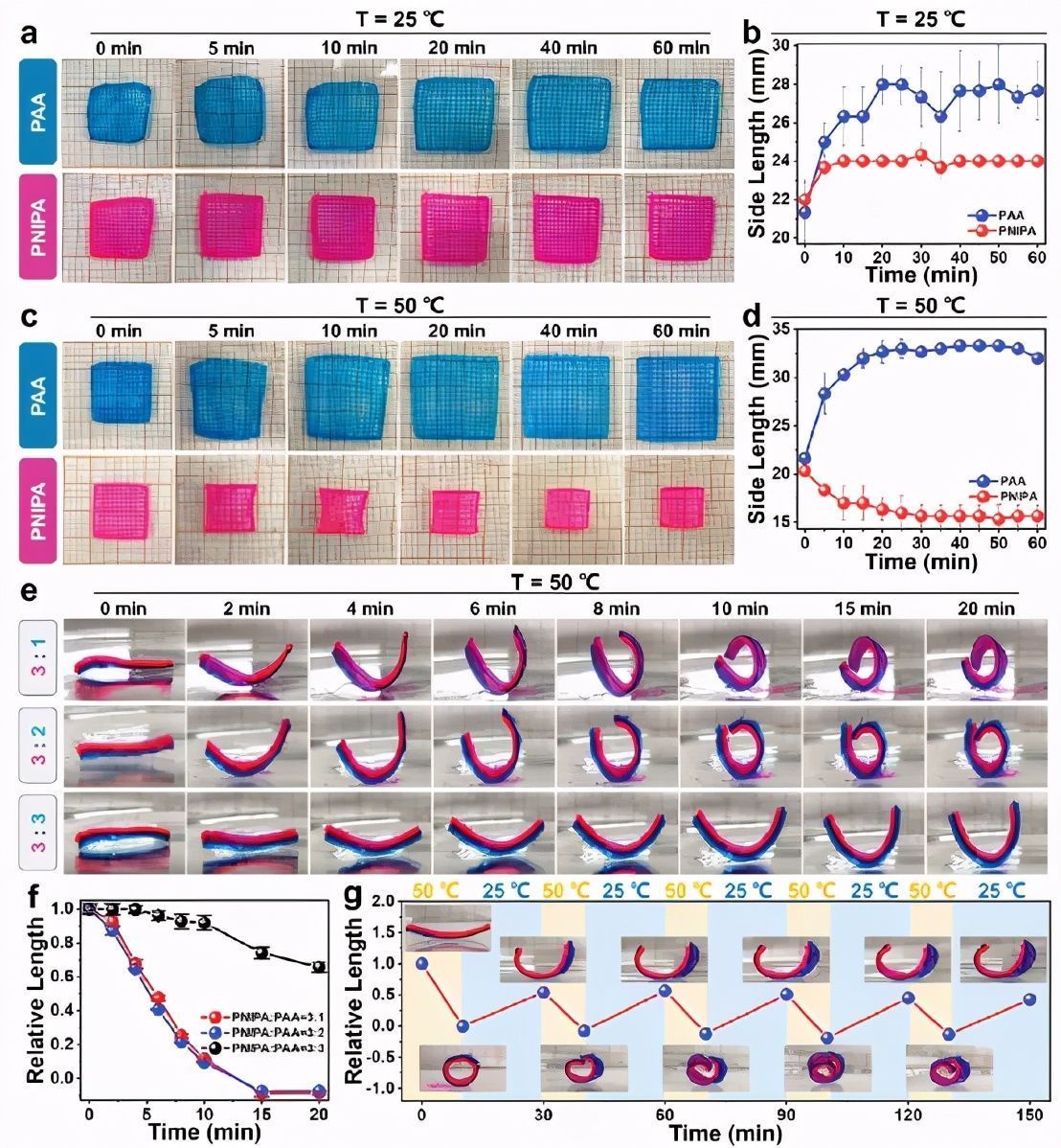 图4 PNIPA 水凝胶的热响应膨胀/收缩和 PNIPA/PAA 双层结构致动器的弯曲/非弯曲特性。